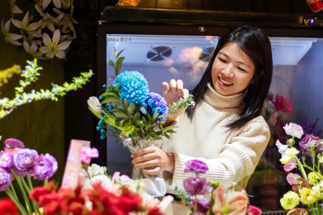 从基地学员到花店店主,陈秀贤的创业之路并非坦途。为积累实战经验,她曾在花店当免费学徒长达7个月。“从修剪花材、养护鲜花到盘点耗材、打包花束,每个环节都是学问。”在做花店学徒的这段日子里,陈秀贤每天工作至少十个小时,情人节高峰期还连续通宵帮忙包花束。