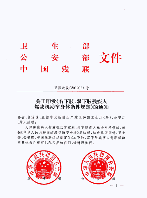 为保障残疾人驾驶机动车权利,拓宽残疾人社会生活领域,依据《中华人民共和国道路交通安全法》等法律,结合我国国情,卫生部、公安部、中国残联组织制定了《右下肢、双下肢残疾人驾驶机动车身体条件规定》,现印发给你们,请遵照执行。
