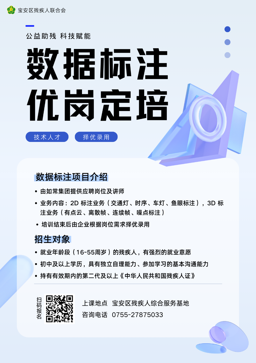 “公益助残·优岗定培”促进就业行动,为残疾人提供“岗位培训”服务。由企业提供应聘岗位及对应岗位培训讲师,宝安区残疾人综合服务基地发布岗位需求及组织残疾人参加培训,培训结束后由企业根据岗位需求择优录用。数据标注产业发展,具有广阔的发展空间与庞大的就业市场。