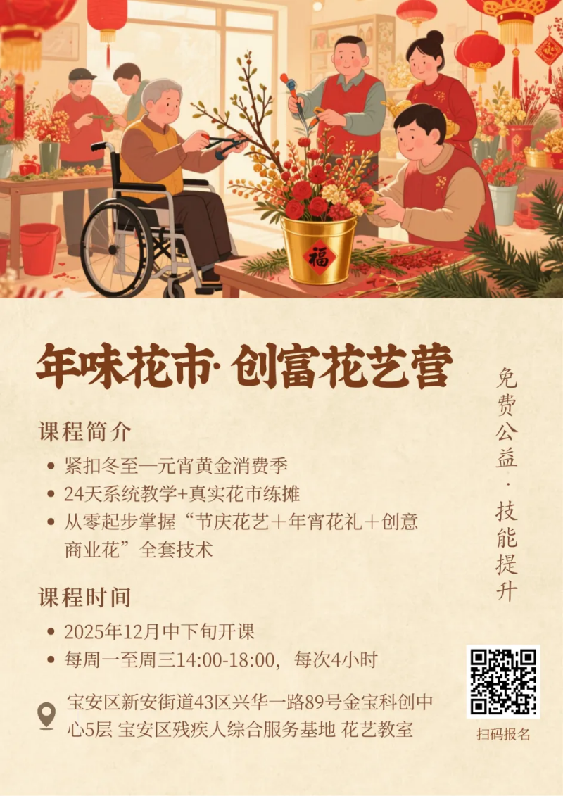 “年味花市·创富花艺营”——全免费公益技能提升项目。课程紧扣冬至—元宵黄金消费季,24天系统教学+真实花市练摊,让学员从零起步掌握“节庆花艺+年宵花礼+创意商业花”全套技术,亲手做出能卖、能展、能参赛的作品,实现“培训—实训—创收”一站式闭环。