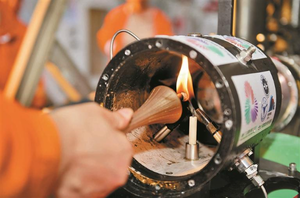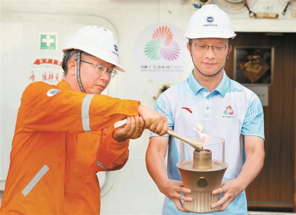 在科考船甲板面,“源火”采集组副组长,广州海洋地质调查局副总工程师沙志彬(左)用引火棒将“源火”转移至“源火”盒。
