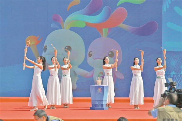 当日,位于广州市南沙区的广州海洋地质调查局科考码头气氛热烈,“梦想”号大洋钻探船就停泊在这里。10时许,火种护卫队将来自1522米深处的海底“源火”安放至“源火”台,采火少女在“源火”台引燃采火棒,国家体育总局、中国残联、广东省委省政府主要负责同志与香港、澳门特别行政区行政长官共同登台,接过采火棒,一起点燃十五运会和残特奥会火种盆,寓意粤港澳三地携手共进、同心筑梦。