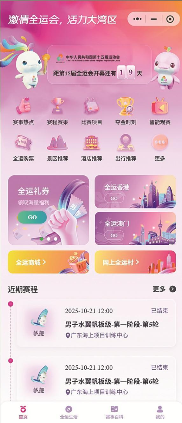 为迎接第十五届全国运动会和残特奥会,广东赛区执委会近日正式上线官方综合服务平台——“粤港澳全运通”小程序。这款集赛事服务、城市导览、互动体验于一体的数字化工具,让观众和游客“一码在手”,即可实现“看比赛、游湾区”双重体验。