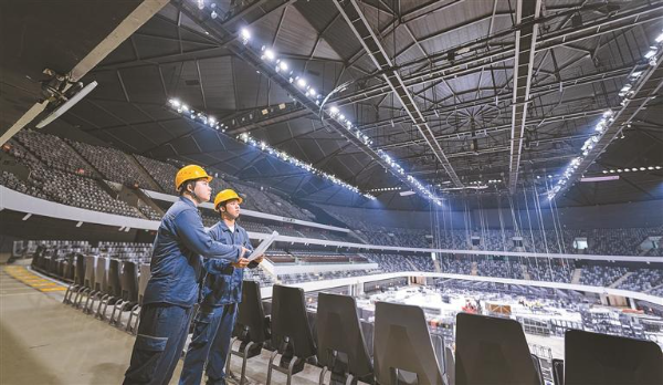 在深圳大运中心体育馆,供电人员在夜间开展大负荷测试,保障场馆用电可靠。