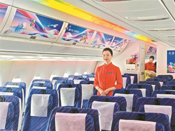 据悉,南航每周在该架飞机执行的深圳往返北京大兴航线上举办主题航班活动,定制十五运会和残特奥会主题广播词,推出季节限定特饮及主题甜品,让旅客在万米高空感受赛场激情。此外,南航全新升级“云端木棉”餐具与“御风飞行”香氛,配合A350动态情景灯光,营造主题客舱氛围。