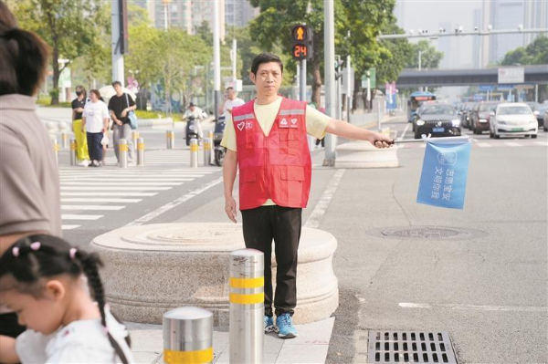 在宝安体育场周边,身穿红马甲的志愿者在进行交通劝导。