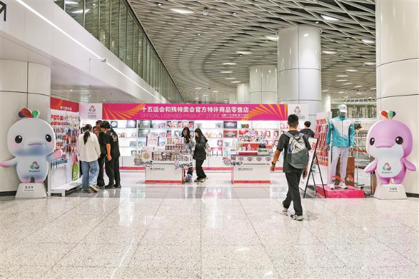 目前,深圳的体育场馆、商场、火车站、机场等地方都能找到十五运会和残特奥会官方特许商品零售店。此外,市民朋友还可以在官方微信小程序选购。