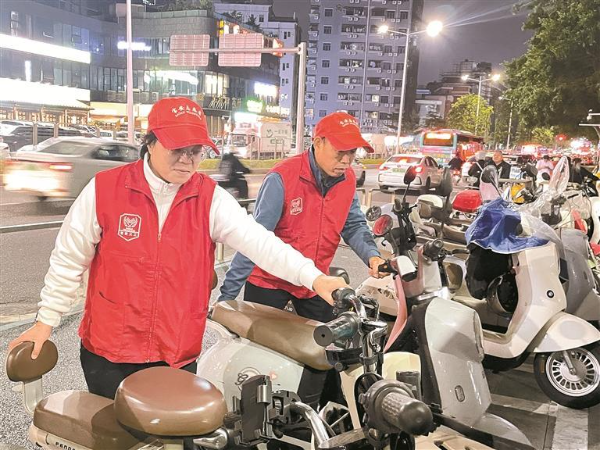 “夫妻档”志愿者卓燕珍和陈时健在地铁口摆放电动车。