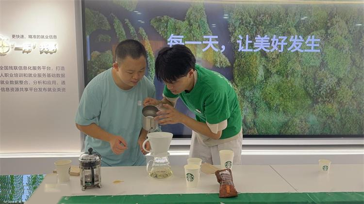 当天,残疾儿童暑期乒乓球训练营正在福康之家一楼多功能体育场火热进行中。代表们向残疾儿童致以问候,并鼓励他们通过运动促进康复,积极走出家门,融入社会。步入福康之家三楼,一阵咖啡香气扑鼻而来,来自深圳首家星巴克手语门店的咖啡师们正在为“心青年”(心智障碍青年)及家属讲解咖啡冲调技巧,手把手教予手冲咖啡冲煮方法,助力“心青年”及家属了解咖啡文化,学习咖啡冲调技能。伴随着咖啡的芬芳,区残联联动深圳唯一入选全国首批“美丽工坊”的大爱艺术品公司开展的“鱼皮画”非遗文化体验活动正在同步开展中,十余名特殊儿童家长认真学习非物质文化遗产“鱼皮画”技艺,在非遗文化的魅力中释放压力,获得喘息,同时家长们还能习得新技能,促进灵活就业。