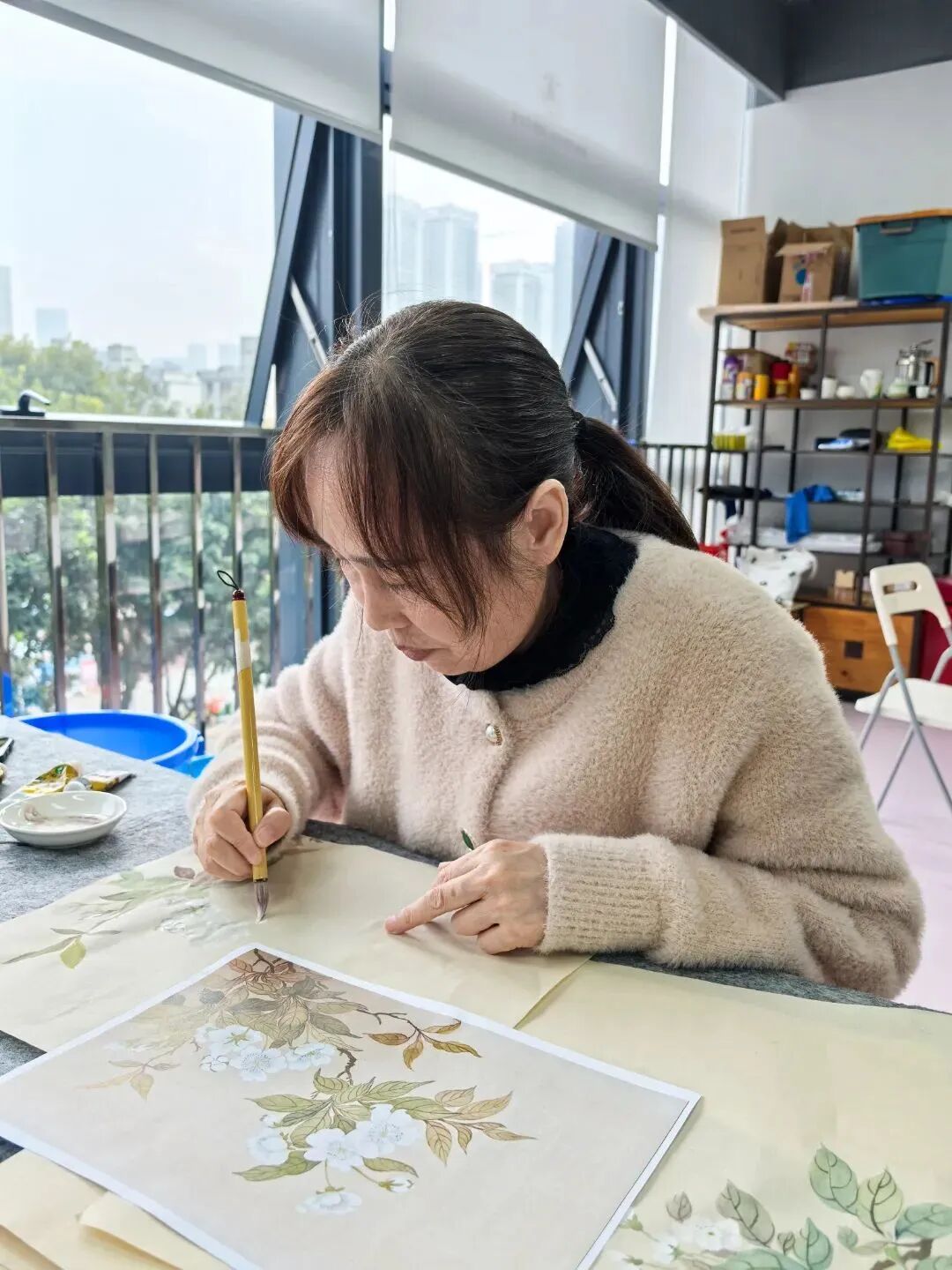 回想起学习书画过程,江艳珍对初学时的困难记忆犹新:“想画一个叶子,颜色、笔触、方向、搭配都不对,画出来死板得很。”她特别感谢老师的耐心指导:“老师会一对一拿着笔教,笔尖该点什么颜色,走势怎么走。多练几次,慢慢就找到感觉了。”
