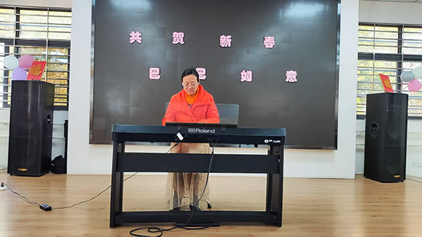 在欢快的热身游戏“拍拍操”带动起现场热烈气氛后,精彩的节目表演正式拉开帷幕。中心的残疾人凭借精湛技艺,带来令人陶醉的乐器演奏。钢琴曲《茉莉花》,以其优美旋律,仿佛将听众带入江南水乡的温婉意境;笛子独奏《渔舟唱晚》,音符灵动,生动描绘出一幅悠然的渔家晚归图。紧接着,夕阳红乐队合唱团以饱满的热情,唱响《好日子》与《我的祖国》,激昂的歌声点燃了现场气氛,引发全场共鸣。最后,工作人员以充满温情的手语舞《如愿》,传达出对大家新一年的美好祈愿,希望所有人在新的一年心想事成。