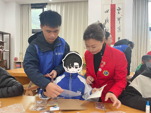 图:大学生志愿者和狮子会狮友陪同制作手工作品