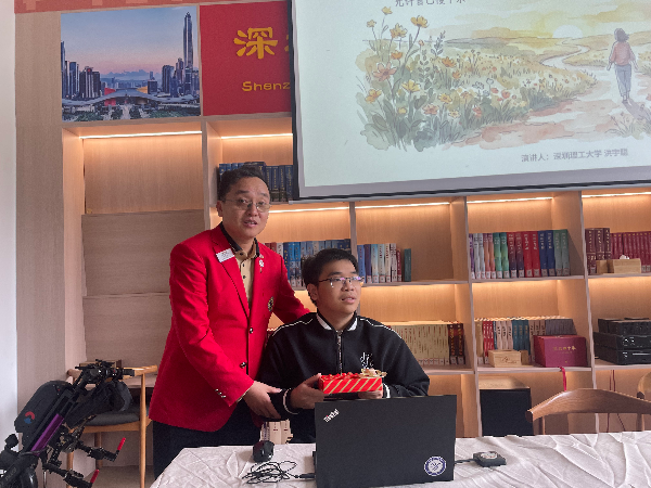 随后,在四海书吧举行的励志分享会上,身残志坚的深理工学子洪宇聪用自己的成长故事激励在场每一个人,其坚韧精神深深打动了特殊需要儿童及其家长。特殊需要儿童家庭代表也上台分享了参与活动的喜悦与感动。现场掌声阵阵,温情流淌。深圳狮子会宏阳服务队为洪宇聪同学送上慰问品并为每个家庭派发新年礼盒,社侨机构代表米雅琪主任向深圳理工大学袁庚书院赠送锦旗,感谢其对融合教育的支持。