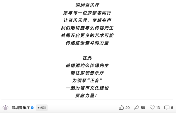 还记得前两天“我的深圳故事”主人公么传锡吗?他是一位盲人钢琴调律师最大的梦想是与深圳音乐厅合作就在今天深圳音乐厅,回应了!么传锡,要圆梦了!几天前深圳首位盲人高级钢琴调律师么传锡在接受记者采访时表示“去音乐厅调钢琴得到他们的认可是我们最大的梦想”报道发出之后4月18日深圳音乐厅发布暖心留言隔空回应么传锡“愿与每一位理想者同行让音乐无界、梦想有声期待能与么传锡先生共同开启更多的艺术可能传递这份奋斗的力量”4月19日深圳音乐厅在官方微信公众号上正式发出邀请函“盛情邀约么传锡先生前往深圳音乐厅为钢琴‘正音’一起为城市文化建设贡献力量!”么传锡在深圳生活超过15年足迹遍布这座城市多个角落为2000多台钢琴“正过音”他参与公益课堂教更多视障人士调律注册公司希望为视障群体拓宽一条新的就业道路么传锡的深圳奋斗故事打动了无数人据了解,么传锡即将负责深圳音乐厅“美丽星期天”公益演出的调律工作让我们共同期待深圳音乐厅与么传锡共同奏响新的梦想乐章来源:深圳卫视深视新闻(责任编辑:沈沁)