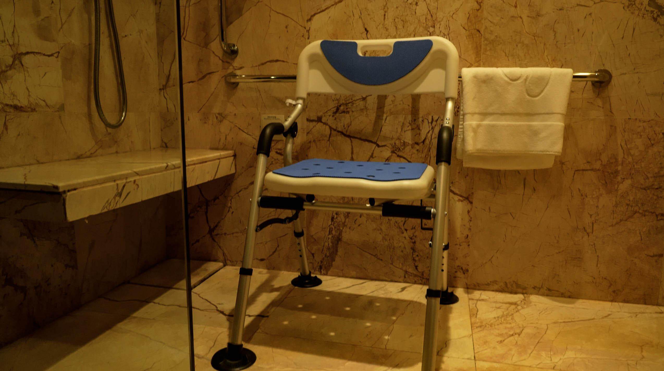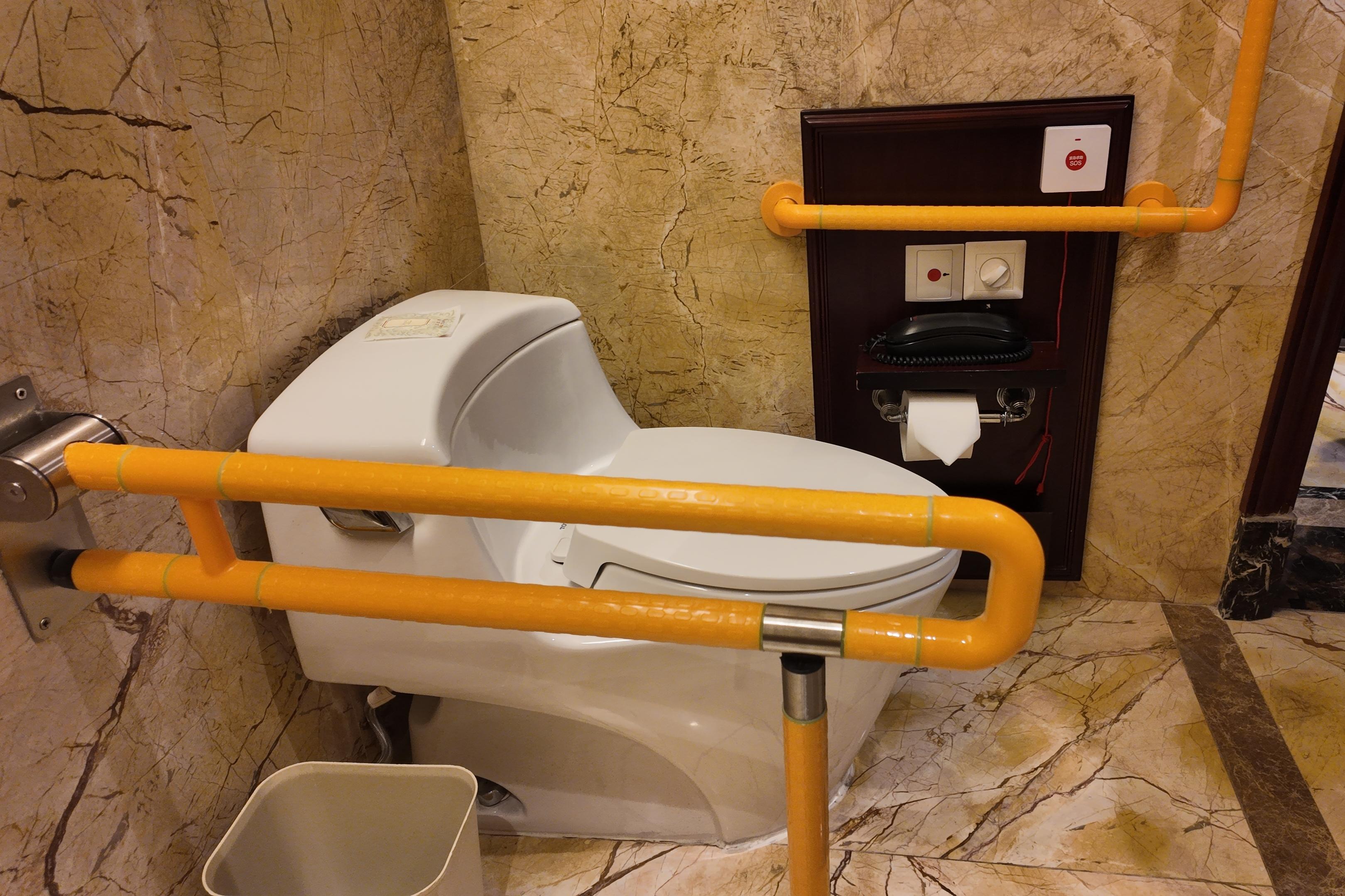 走进酒店大堂,残障人士用品仓储柜和存放区映入眼帘;运动员专属电梯加装了盲道标识、盲文按键和三面镜子;客房内,桌椅棱角处的防撞条,有台阶处新增的缓坡,浴室防滑座椅、扶手,声光报警器及门铃等设施,还有后厨的无死角监控,一一传递着无声的守护。