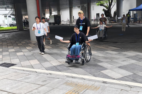 图:工作人员模拟测算轮椅通行的时间