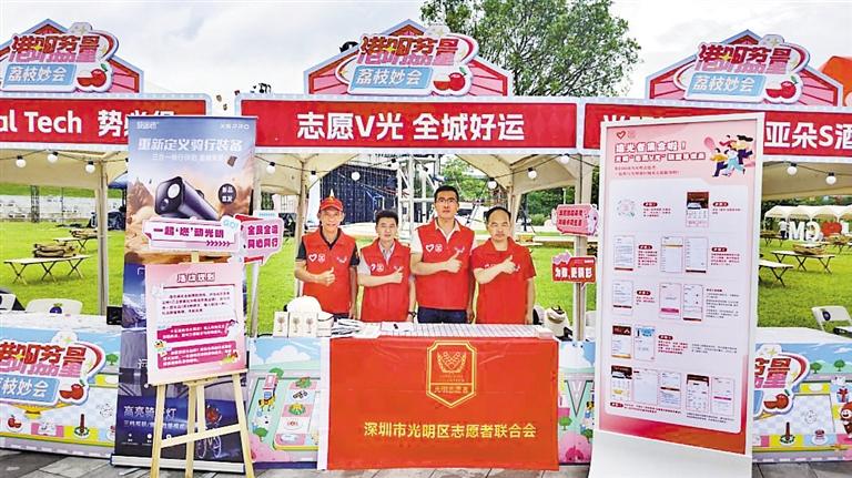 上周末,在位于光明区虹桥公园的港明荔量·荔枝妙会现场,空气里飘着荔枝的甜香,四十多个特色摊位让人眼花缭乱。现场,“志愿V光 全城好运”志愿者招募活动吸引了不少市民的目光。
