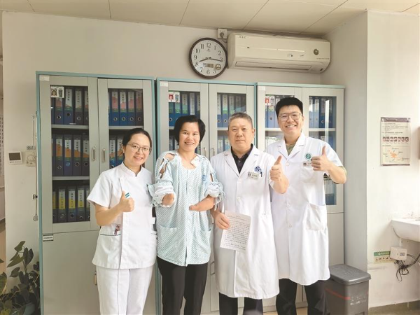 康复后的阮建平(左二)与北中医深圳医院医生护士合影。 受访者供图
