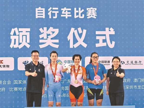 阮建平(中)参加残特奥会自行车比赛颁奖仪式。 省残联 李新福供图