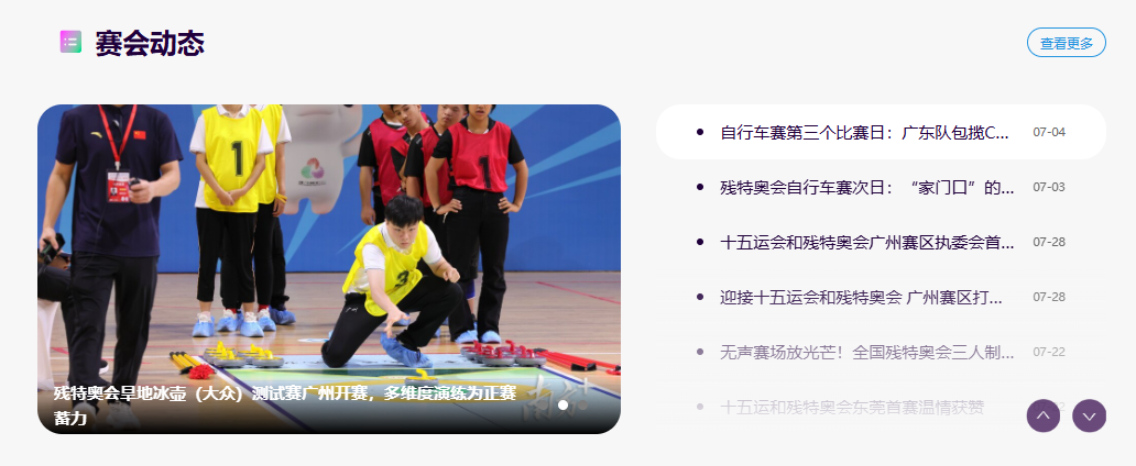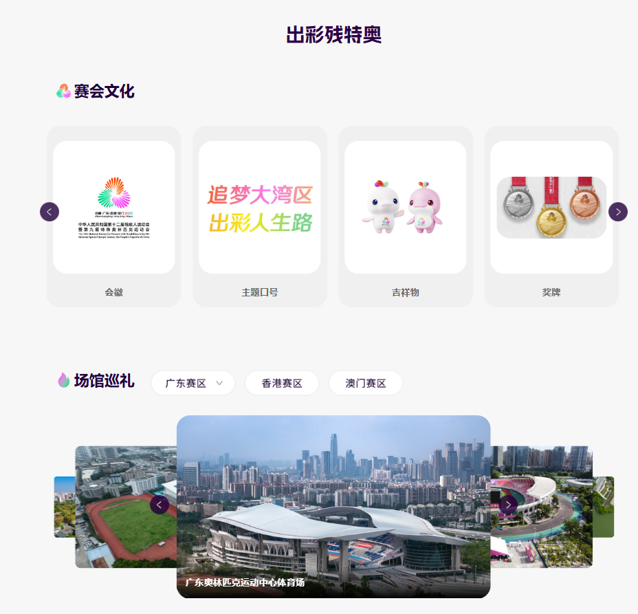 2025年8月8日 十五运会和残特奥会 新版官网全新升级上线! 新版官网以海丝蓝为主色调,提供十五运会和残特奥会筹办信息、赛程展示、赛场动态、场馆介绍等丰富资讯,重点介绍粤港澳三地在联合办赛上的创新实践、聚合赛会各类便民线上应用、提供多样化贴心线上服务。 残特奥会新版官网首页 新版官网有啥亮点? 操作如何更便捷? 服务如何更贴心? 跟着小编的脚步一起看新版官网! 十五运会和残特奥会是迄今为止我国规模最大、承办城市最多的一届全运会和残特奥会,新版官网的头部区域分别设置了赛会动态、通知公告、赛程安排、光影赛场、专题报道等栏目,你只需动动手指,即可饱览赛会相关最新资讯,全方位感受赛事的激情和魅力。 赛会标识是每届运动会最重要的文化符号,备受各界关注。为了让大家更好了解其文化内涵,新版官网重点展示本届赛会会徽、吉祥物、主题口号、奖牌、火炬等高清图片和文字解说。在官网的“场馆巡礼”栏目,还可以详细了解粤港澳三地比赛场馆分布情况及赛事安排。 “全民全运,全运惠民”,十五运会官网专门开设了“全民迎全运”板块,全方位展示十五运会群众赛事资讯,参赛选手还可查询参赛名单和成绩,下载比赛证书等。 残特奥会官网则专门设置了“出彩残特奥”板块,通过“出彩人生”“科技助残”“特奥赋能”等栏目,充分展示运动为残疾人带来的积极改变,讲述特奥运动如何让智力残疾人更好融入社会,科技创新如何为残疾人提升生活质量。 新版官网还设置“赛事服务”板块,将分批次聚合官方票务平台、气象服务、无障碍服务、志愿服务、医疗服务等线上应用,可在线购买赛事门票,申请手语翻译、远程志愿者、辅具保障等服务,还可查询各赛区定点医院、定点药店、气象预报信息和办理无线电申请手续等。 为照顾老年群体和残障人士的阅读需求,十五运会和残特奥会新版官网都全面部署适老化、无障碍等应用服务,有需要的受众在顶部导航栏点击相关按钮,即可顺畅浏览官网资讯。为照顾港澳同胞阅读习惯,新版官网还提供简繁体字一键切换快捷按钮。 粤港澳地域文化同源、民俗相近、优势互补,这是三地共同举办十五运会和残特奥会的有利条件。为让大家更多了解三地发展成果及在联合办赛上的创新实践,新版官网均精心设置了“走进粤港澳”板块。在这里,可以对各个赛区有更直观的印象,可通过“旅游资讯”“岭南风味”“科技创新”“生态保护”“协同发展”等栏目,跟着赛事去旅游打卡,循着攻略品尝特色美食,体验粤港澳最新科技成果,聆听岭南大地绿水青山故事,纵览湾区城市协同发展新图景。 11月 欢迎大家先来广东喝早茶 看游泳比赛 再到香港吃一碗鲜虾云吞面 看击剑比赛 然后到澳门尝几个葡式蛋挞 看乒乓球比赛 特色美食、精彩赛事 粤港澳大湾区约定你