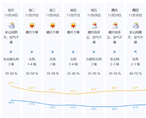 预计今天白天晴天间多云,空气干燥,偏北风2-3级,最高气温25-26℃;
