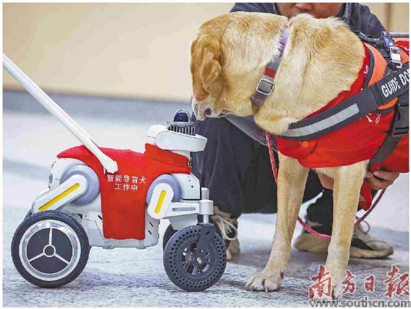 以科技手段为残特奥会保驾护航,深圳地铁在赛事期间启用了智能“导盲犬”。图为黄木岗站,导盲犬遇上“导盲犬”。南方日报记者 朱洪波 摄