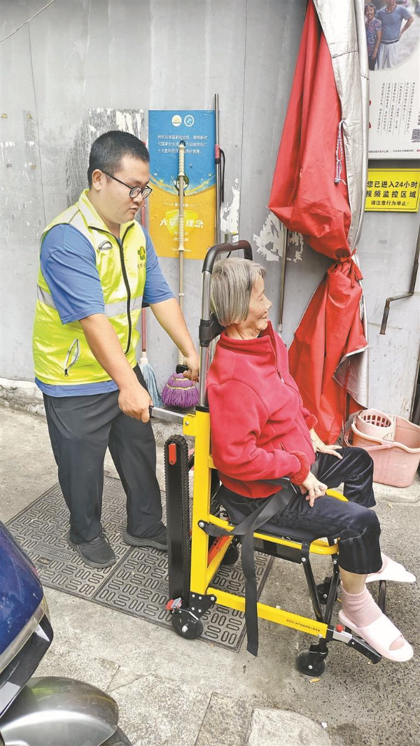 工作人员使用爬楼机帮助老人出行。