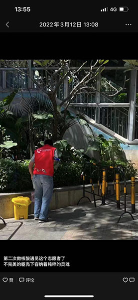" 第二次做核酸遇见这个志愿者,不完美的躯壳下容纳着纯粹的灵魂。" 有社区居民被张文汉平凡亦闪光的抗疫精神深深感染,并偷偷拍了他工作时的照片,发朋友圈感叹道。