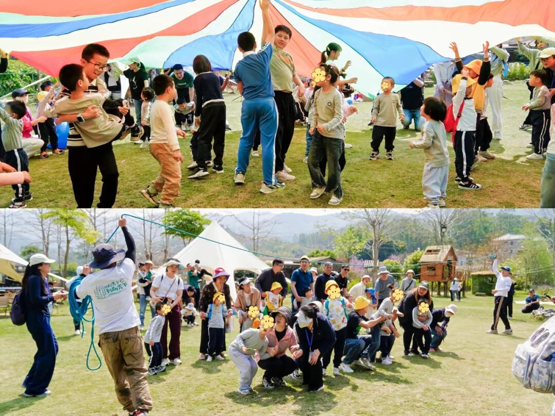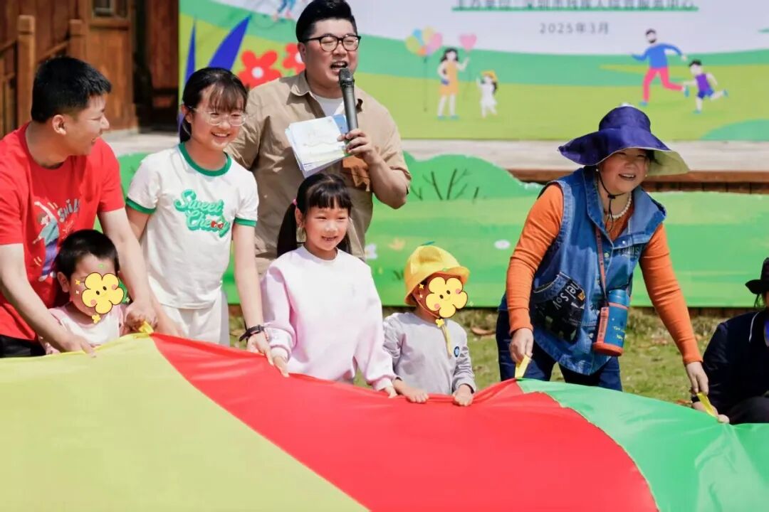 “妈妈快看,小羊在吃我喂的胡萝卜!”稚嫩的童声穿透春风,孩子们在动物喂养区与自然生灵亲密对话。当亲子小火车载着欢声笑语穿梭花海,当创意石头画在百余双巧手下绽放艺术之花,大自然的疗愈力量悄然浸润着每个特殊需要儿童的心灵。在“春日创意秀”环节,特殊需要儿童家庭与普通家庭协同创作,用格桑花瓣装点衣裙,以百香果藤蔓编织头饰,共同完成了一场别开生面的自然T台秀。七彩的彩虹伞随着和煦的春风有节奏的上下翻飞,为孩子们印染出春天的色彩。精彩刺激的亲子游戏“横扫千军”更是将孩子们的欢声笑语融入春色的韵味中。活动现场气氛温馨欢快。