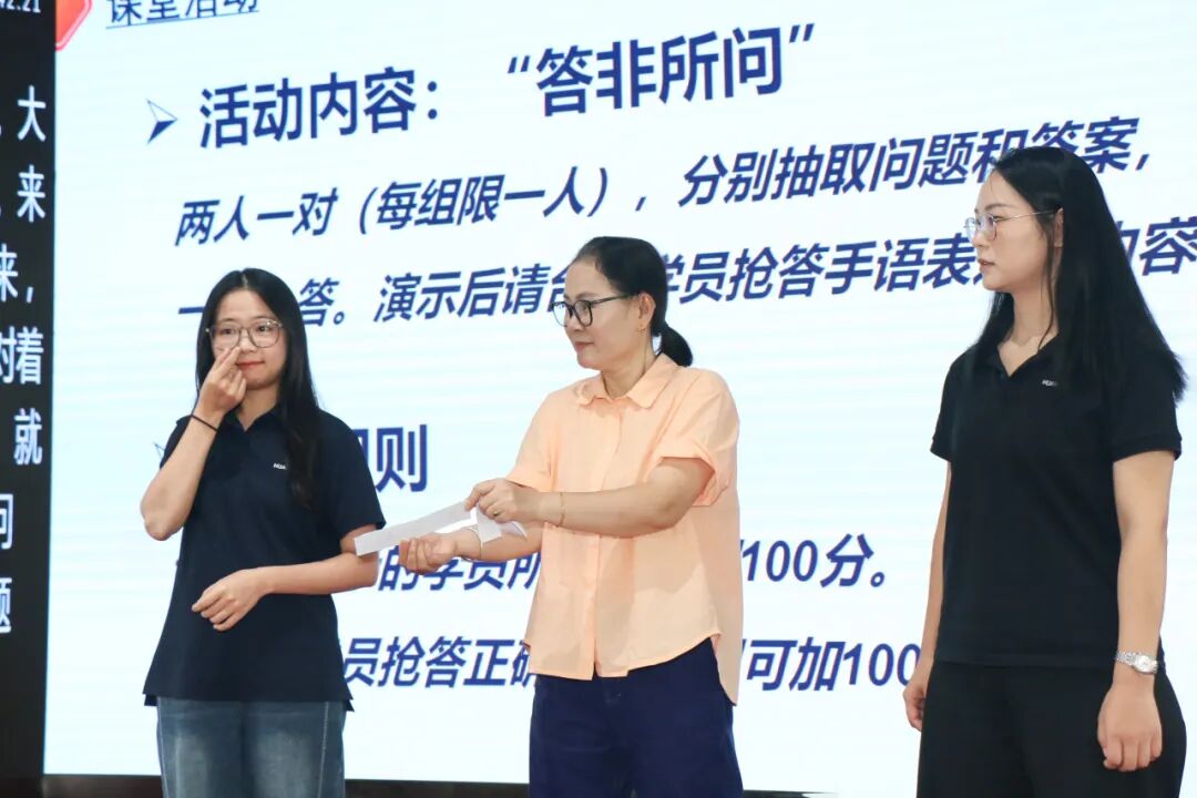 培训内容丰富且实用,涵盖手语理论知识、日常手语、公共服务手语的词汇及情景对话教学,每节手语课后都会设置游戏抢答、对话实操等课堂活动环节,充分兼顾理论基础与实践应用,让学员在快乐的教堂中轻松学习手语知识。