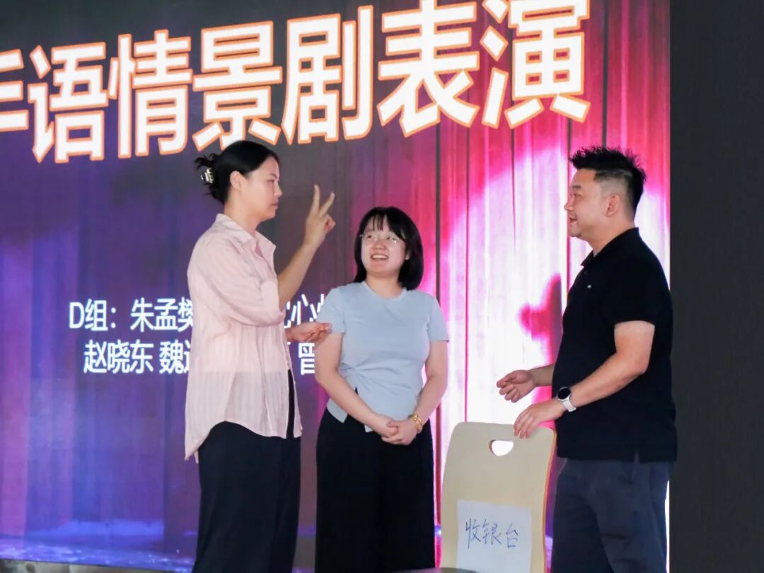 培训结束后,每一组学员都上台进行了结课展示表演。他们以情景剧的方式,展示了就医、法律维权、交通出行、购物就餐、社交等日常生活不同场景中,如何用手语进行交流。通过两天的学习,学员们的手语在此时展现出优秀的学习成果,精彩有趣的表演引来台下观众欢笑鼓掌,线上直播也在此时吸引了最多观众观看。有在海外的华人手语专家(也是听障人士)观看直播后表示学员们的结课展示太赞了,呈现的内容丰富且精彩,为大家竖起了大拇指。
