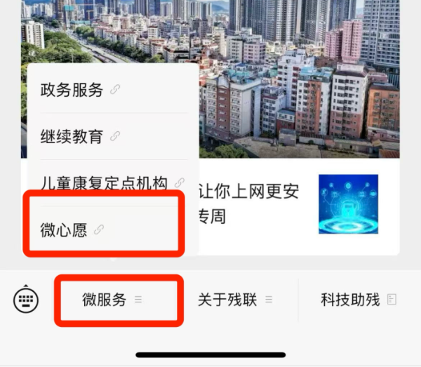 02、进入公众号后,在主菜单栏点击【微服务】→【微心愿】,进入活动平台;