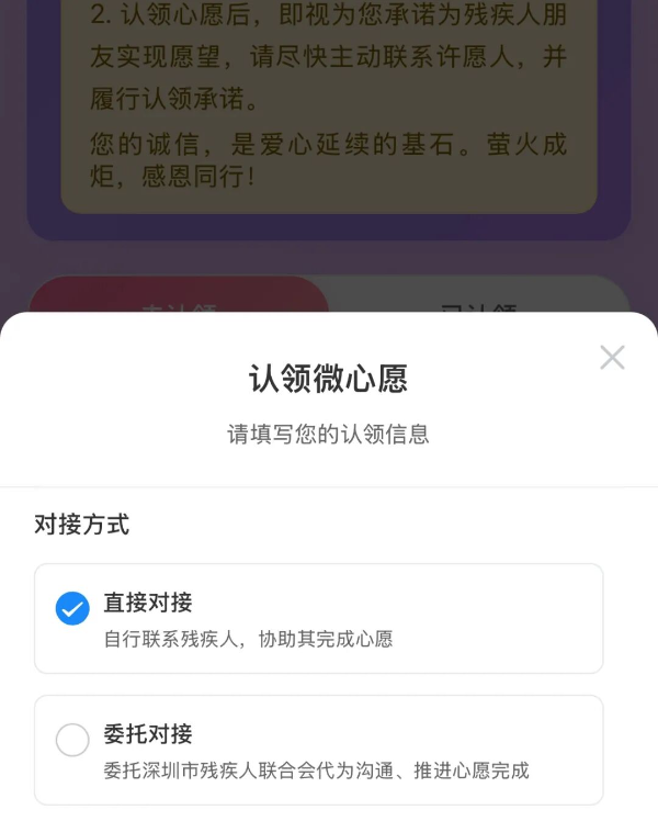 2、在【委托对接】环节,工作人员仅承担中间协调职责,负责代认领人与许愿残疾人对接心愿细节(如需求补充、帮扶方式等);沟通完成后,工作人员会及时将心愿执行的具体事项(如时间、地点、物品规格等)同步给认领人。