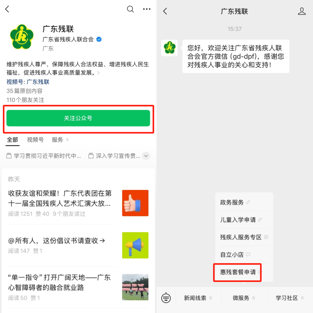 2、关注“广东残联”微信公众号,点击“微服务”-“惠残套餐申请”下单