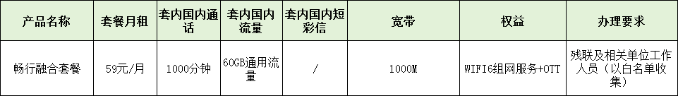 融合类:59元/月享100分钟通话+160GB流量(130GB通用+30GB专属),叠加1000M千兆宽带,兼顾个人通信与家庭网络需求。