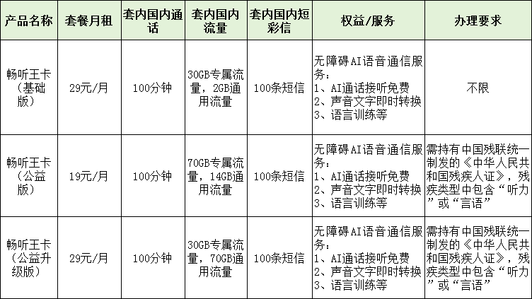 单卡类:公益版月租仅19元,含70GB专属流量+14GB通用流量+100分钟通话,可免费使用“AI通话接听、语音文字即时转换、语言训练”服务;公益升级版29元/月,通用流量提升至70GB,满足高频上网需求;